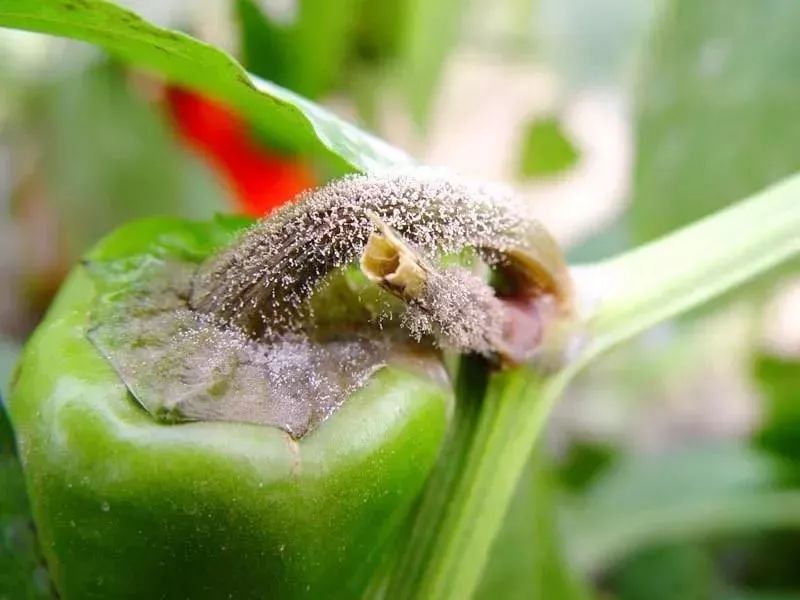 4、果实染病青果受害重,残留的柱头或花瓣多先被侵染,或向果面或果柄扩展,致果皮呈灰白色,软腐,后长出大量灰绿色霉层。