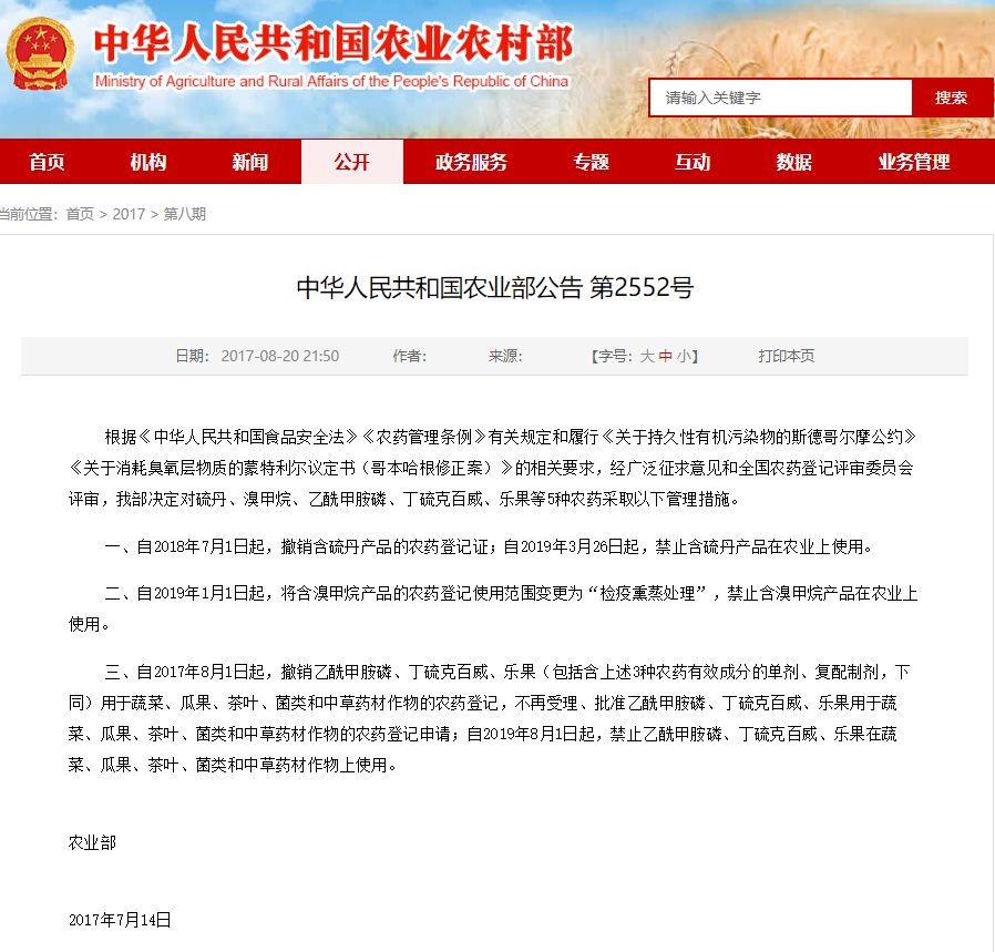 根据农业农村部公告第2552号,自2019年8月1日起,禁止乙酰甲胺磷、丁硫克百威、乐果在蔬菜、瓜果、茶叶、菌类和中草药材作物上使用。