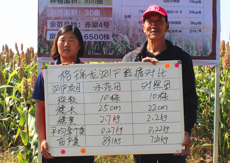 根据样点测产所得示范田亩产量为891kg,对照田亩产量为726kg,在亩成本相同情况下示范田比对照田每亩增产165kg,种植户对本次测产的结果表示非常满意。