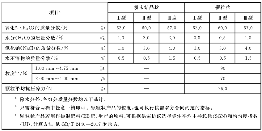 已在2012年6月1日实施的标准将农业氯化钾分为优等品、一等品、合格品三大类。不同的是,此次新颁布的标准并未按上述等级名称进行划分,而是将氯化钾肥料分为粉末结晶状、颗粒状两大类型,对应有Ⅰ型、Ⅱ型、Ⅲ型三挡,且技术指标大幅提升。