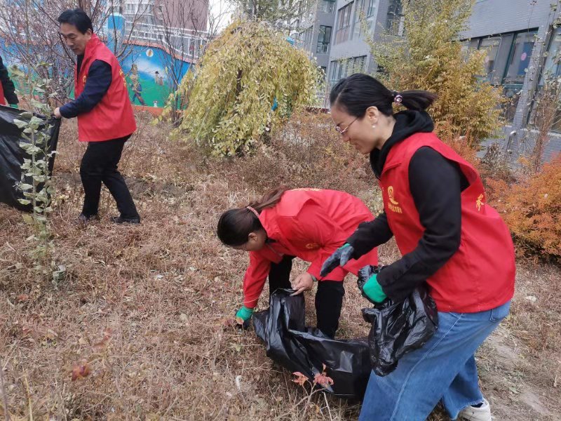 党员志愿者们在宣誓之后穿上了红色的志愿服,领取了垃圾袋和手套,大家开始了分组沿小区道路拾捡草坪和小道上的废纸、食品袋、塑料袋、饮料瓶等垃圾。