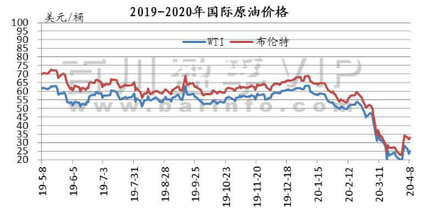 本周周内受OPEC+会议将达成减产预期的言论提振,国际油价整体上涨。原油价格先跌后涨。其中WTI期货本周均价25.69美元/桶,较上周上涨22.35%,较上月下跌15.61%;本周布伦特期货均价32.36美元/桶,较上周上涨33.17%,较上月下跌4.05%。