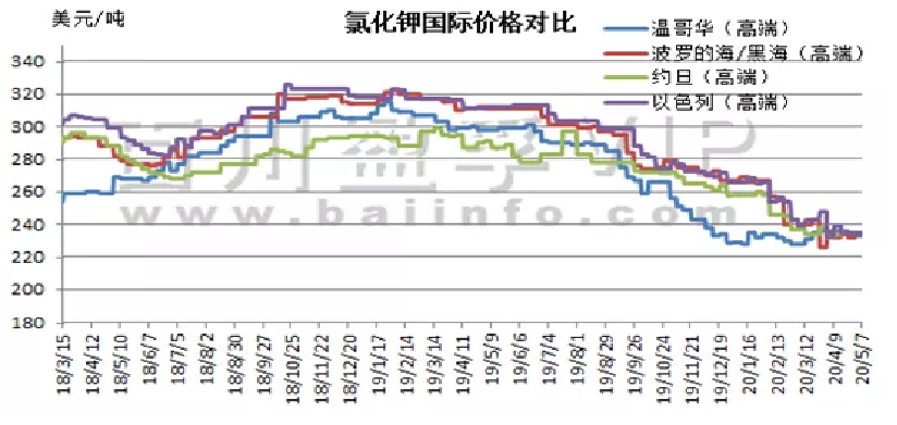 一、2020年4月30日,历时19个月,中方小组与白俄罗斯钾肥公司(BPC)就2020年钾肥进口合同达成一致,价格为CFR220美元/吨,较2018年下降70美元/吨。继中方与白俄罗斯钾肥公司(BPC)达成协议后,以色列化工(ICL)与中方达成大合同协议,至2020年底,供应91万吨钾肥,可选量49万吨,价格CFR220美元/吨。以色列化工(ICL)于18年11月6日与中方续签三年期框架协议,将于2019年至2021年期间向中国供应钾肥。据悉俄罗斯乌拉尔钾肥公司(Uralkali)对价格和条件表示保留,并正在审查是否同意相同的条款。但其他供应商对中国的货运询盘已经出现,未来几周或将宣布更多交易。而当地时间2020年5月12日,印度也与加拿大钾肥公司Canpotex达成2020年钾肥进口合同,价格为CFR230美元/吨,较中国进口合同价格高10美元/吨,装运期至2020年12月31日。中国及印度两大进口市场相继达成钾肥进口协议,钾肥市场逐渐明朗,后期也将对国际钾肥市场价格产生一定影响。