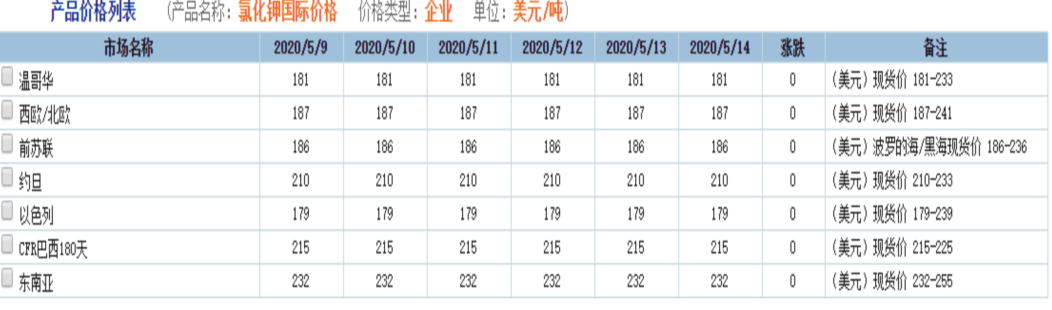 氯化钾市场弱势观望,市场成交积极性不佳,看空气氛较浓。当地时间2020年5月12日,印度也与加拿大钾肥公司Canpotex达成2020年钾肥进口合同,价格为CFR230美元/吨,较中国进口合同价格高10美元/吨,装运期至2020年12月31日。
