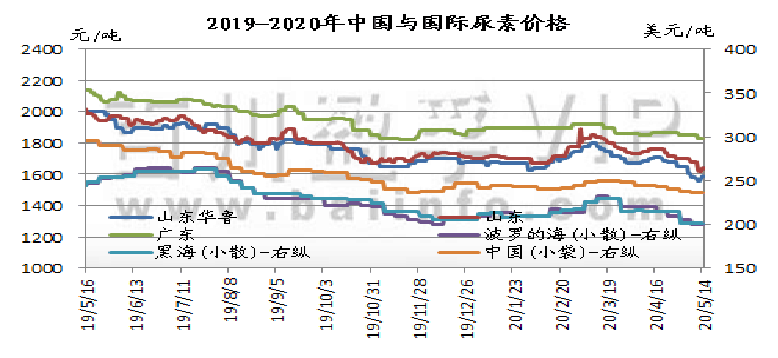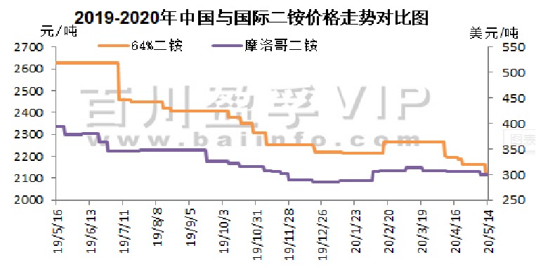 本周氯化钾市场看空气氛较浓,新单成交有限,价格持续走低,国产及进口钾价格均有所下滑,盐湖到站价格下调280元/吨,保底政策依然执行。保税区货源将陆续开始过货。以色列化工与中国签订钾肥大合同,到2020年底,总共供应91万吨钾肥,并有可选量49万吨。合同价格为220美元/吨,延续此前达成的19-21年向中国供应钾肥的框架协议。当地时间2020年5月12日,印度也与加拿大钾肥公司Canpotex达成2020年钾肥进口合同,价格为CFR230美元/吨,较中国进口合同价格高10美元/吨,装运期至2020年12月31日。澳大利亚氯化钾价格下跌,反映出其他地区早期价格下跌趋势。