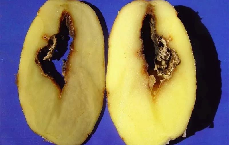 2、马铃薯茎染病,出现褐色条纹。块茎染病,轻的不明显,重的脐部呈灰褐色水浸状,切开蕾块,维管束变褐色,挤压时可溢出乳白色粘液,但马铃薯肉和内皮组织不分离。病重的薯块,芽眼被侵害,不能发芽.全薯腐烂。
