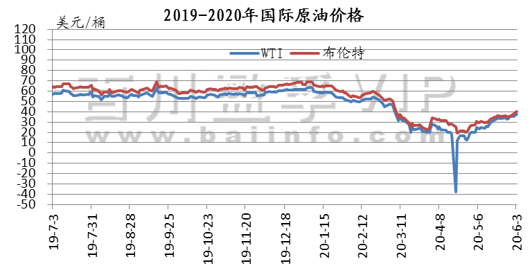 本周周内OPEC+视频会议预期及美国原油产量及库存下降支撑油价,国际原油整体上涨。国际油价震荡上涨。其中WTI期货本周均价35.75美元/桶,较上周上涨6.45%,较上月上涨24.33%;本周布伦特期货均价37.66美元/桶,较上周上涨6.01%,较上月上涨16.19%。