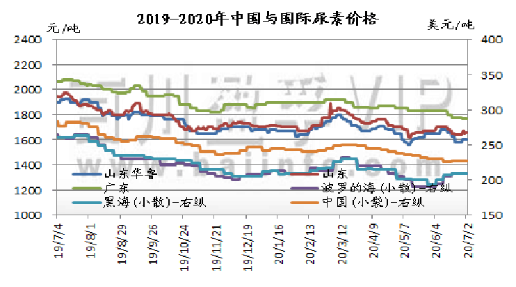 本周(2020.6.29-2020.7.2)二铵市场价格弱势持稳运行,国内市场淡季,需求较少,企业主要重心港口,心态一般。云贵地区64%主流成交价格维持在2050-2100元/吨,湖北主流成交价格2100-2150元/吨。目前国内主流64%成交价格暂稳至2050-2150元/吨。国际方面需求旺盛,由于南亚和东南亚地区需求上涨,中国DAP价格从305-308美元/吨FOB上调至306-309美元/吨FOB。
