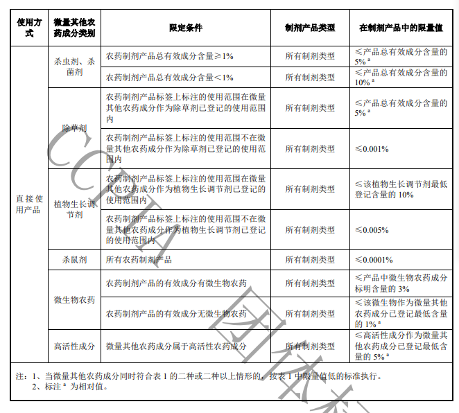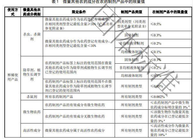 为规范我国农药制剂产品中微量其他农药成分限量标准,补充完善农药产品的质量标准中杂质含量要求,2019年4月,由中国农药工业协会和农业农村部农药检定所共同提出并组织制定的团体标准《农药制剂产品中微量其他农药成分限量》发布,并于2019年10月正式实施。