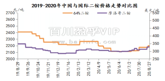 本周(2020.8.21-2020.8.27)国内磷酸二铵市场产销两旺,本周二湖北货源正式官宣调涨价格:64%二铵出厂价整体调涨至2250-2280元/吨,高端报价出厂2350元/吨,实际新单出厂成交价2200-2250元/吨;西南货源64%二铵主流出厂报价2200-2250元/吨以上,实际新单成交2180-2200元/吨左右。华北地区64%二铵主流第一到站价2500元/吨。由于今年二铵同比价格偏低,受国内外需求拉动,实际成交价格逐步回归正常水平。