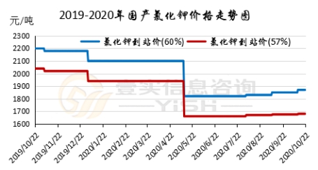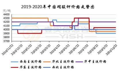 2020.10.15-2020.10.22硫酸钾市场维持观望盘整态势,原料成本增加,云南烟草招标对市场供应有一定消化,市场价格有回升趋势。