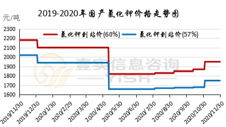 11月硫酸钾市场挺价盘整运行,价格小幅上行,市场供应量有所减少,原料成本有一定支撑,开工暂无明显波动,下游需求缓慢推进。罗钾2020年度销售任务已完成,售价持续两次上调。硫酸钾10月出口量4.3万吨,1-10月硫酸钾出口33.39万吨,同比上涨13.81%。曼海姆硫酸钾50%粉主流出厂价2500-2600元/吨左右,52%粉出厂价2600-2700元/吨左右,优惠幅度在50-100元/吨。东北地区50%粉主流出厂报价2500元/吨;华南地区价格相对较高,50%粉主流出厂报价2950元/吨。青海水盐体系硫酸钾主流到站报价2350-2400元/吨左右,成交有限,实际成交可谈。国投罗钾公司硫酸钾装置正常生产,罗钾52%粉末硫酸钾现汇价格2750元/吨,市场前期货源有限。