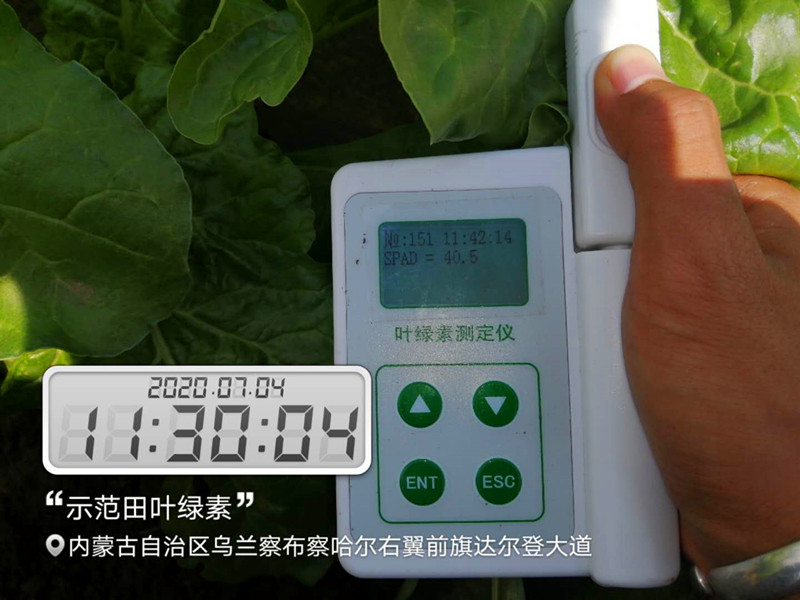 监测记录:对种植户甜菜进行测量,随机选出10株,测量结果取平均值,测量株高、叶绿素含量等。经测量植株株高在800px左右,叶绿素含量在41左右,叶片黑绿,长势足。