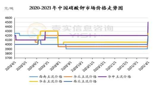 本周(2021.3.26-4.1)华东地区硝酸钾市场维稳观望运行,近期硝酸钾市场行情变化不大,维护老客户为主,下游接单情况尚可;西南地区硝酸钾价格有上涨趋势,由于上游产品价格持续坚挺,导致硝酸钾市场供货紧张,预计短时硝酸钾市场将向好整理,价格或将小幅上行,出口订单增多,市场处于供不应求的状态;华北地区硝酸钾市场整体表现供应紧张,用肥旺季,市场需求增量,目前企业预收量较大,部分企业暂停报价,限制接单,促使硝酸钾市场价格一再探涨。西北地区硝酸钾部分厂家价格小幅上调,市场行情向好发展,下游需求良好,接单正常。