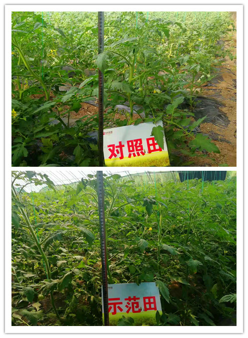结论:在6月11日施用格瑞龙生物菌剂7天后,挖取西红柿幼苗观察测量其根部情况,发现使用过格瑞龙生物菌剂的幼苗根系比未使用过格瑞龙生物菌剂的对照幼苗的根系多而发达;西红柿示范田为50元/亩,对照田为200元/亩;种植户对示范田效果很满意。
