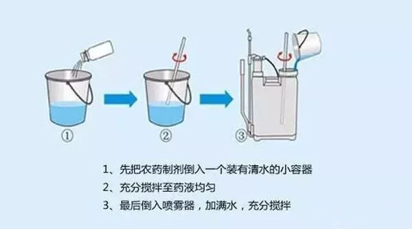 正确的配制方法是二次稀释法:先将药剂加少量水配成母液,再倒入盛有一定量水的喷雾器内,再加入需加的水量,并边加边搅拌,调匀稀释至需要浓度。切忌先倒入药剂后加水,这样药剂容易在喷雾器的吸水管处沉积,使先喷出的药液浓度高,容易产生药害,后喷出的药液浓度低,除草效果差。也不可将药剂一下倒入盛有大量水的喷雾器内,这样可湿性粉剂往往漂浮在水表或结成小块,分布不均匀,不但不能保证效果而且喷雾时易阻塞喷孔。另外,药液要用清洁水配制。
