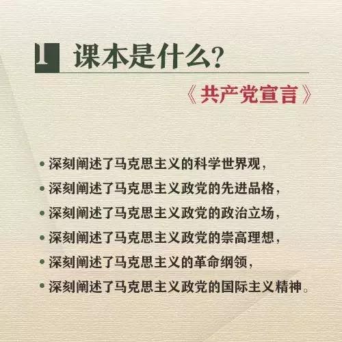4、《共产党宣言》是一个内容丰富的理论宝库,值得我们反复学习、深入研究,不断从中汲取思想营养。