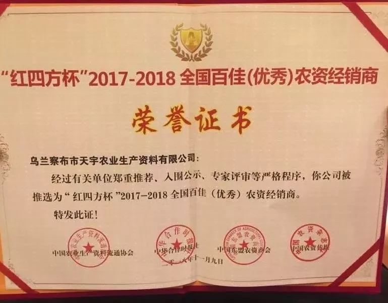 我集团旗下乌兰察布市天宇农业生产资料有限责任公司再次成功被评为“红四方杯”2017-2018全国百佳(优秀)农资经销商称号,公司董事长陈璞获评“懂爱”的人称号。